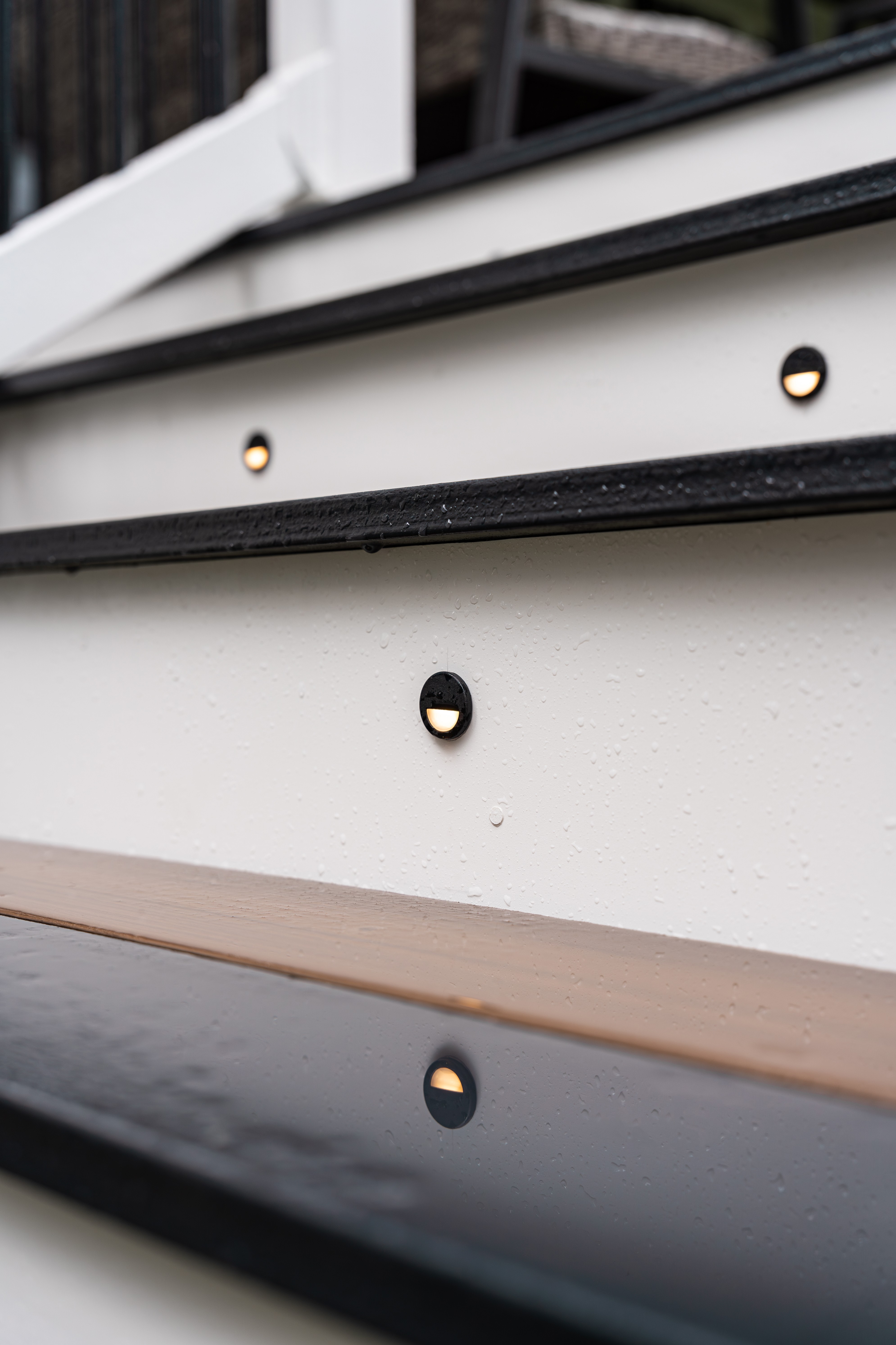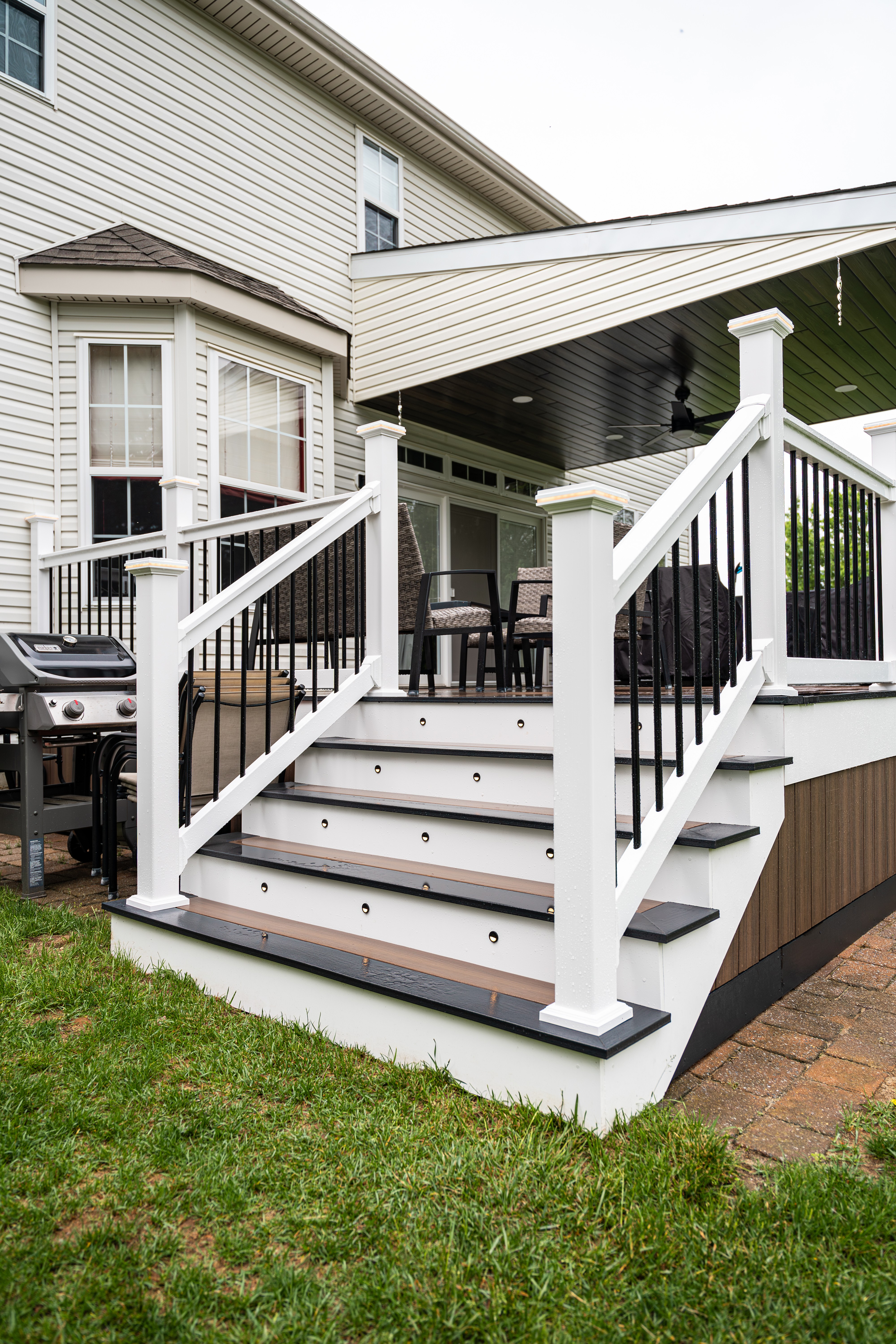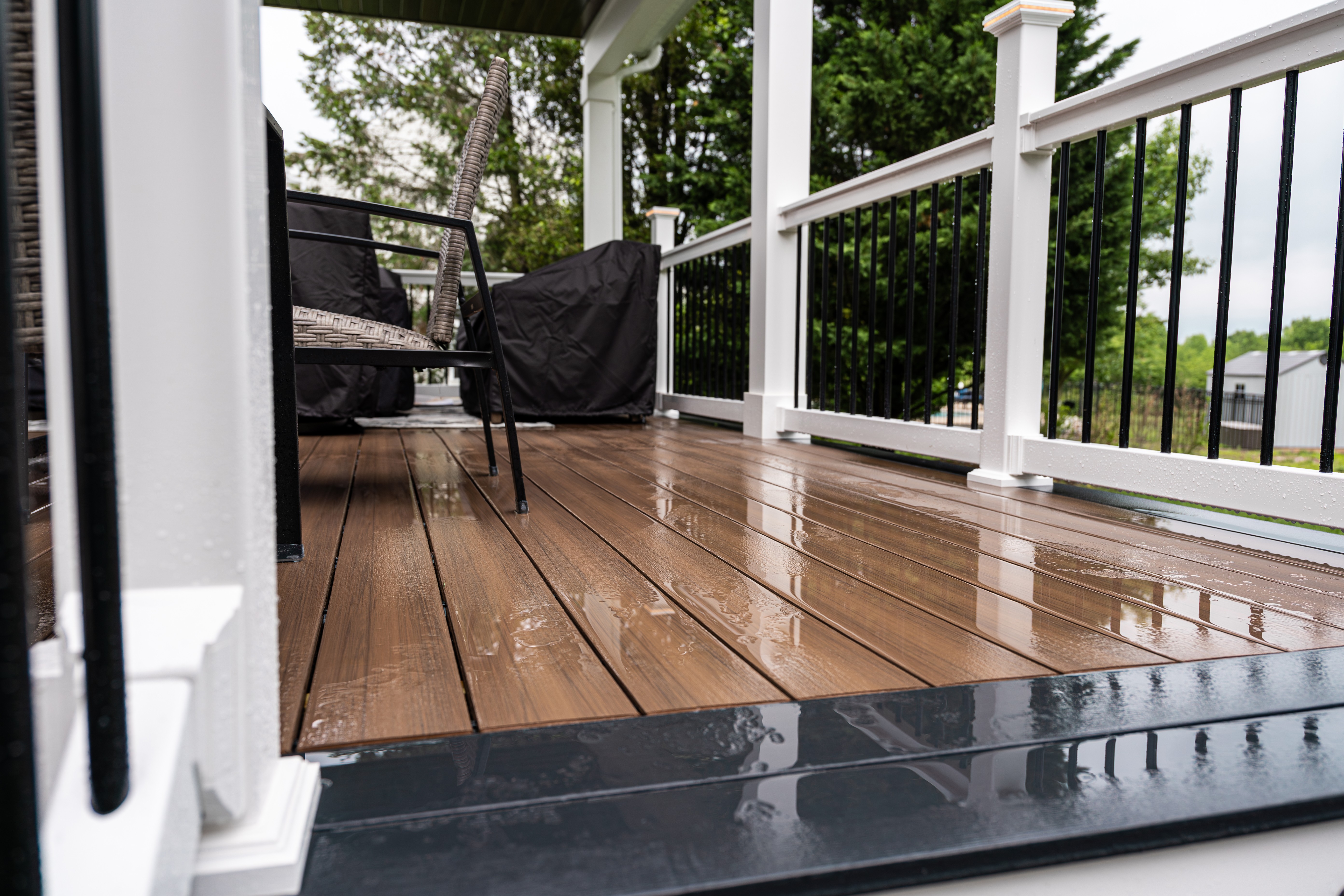 Rain or shine, this backyard is usable. The photos were taken on a wet spring day — and the deck still looks magazine-ready. The composite surface sheds water cleanly, the PVC railing won't rot or chalk, and the covered porch means the homeowner can enjoy the space even during a summer downpour.