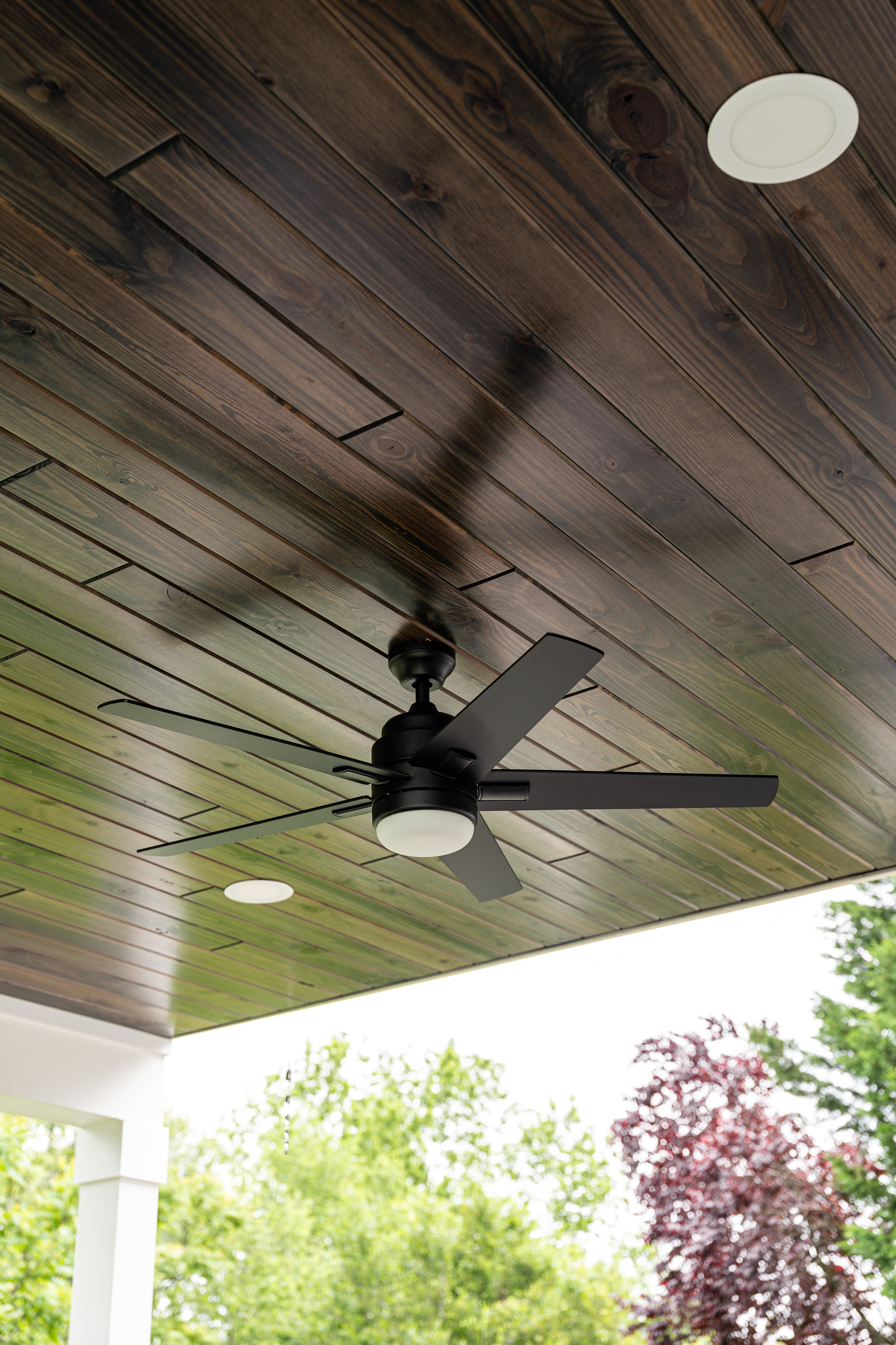 The covered porch ceiling is the project's showpiece. Dark-stained tongue-and-groove cedar planks were installed horizontally across the entire underside of the roof, with flush recessed lighting flanking a statement matte black ceiling fan. It's the kind of detail that turns a functional overhang into a room.